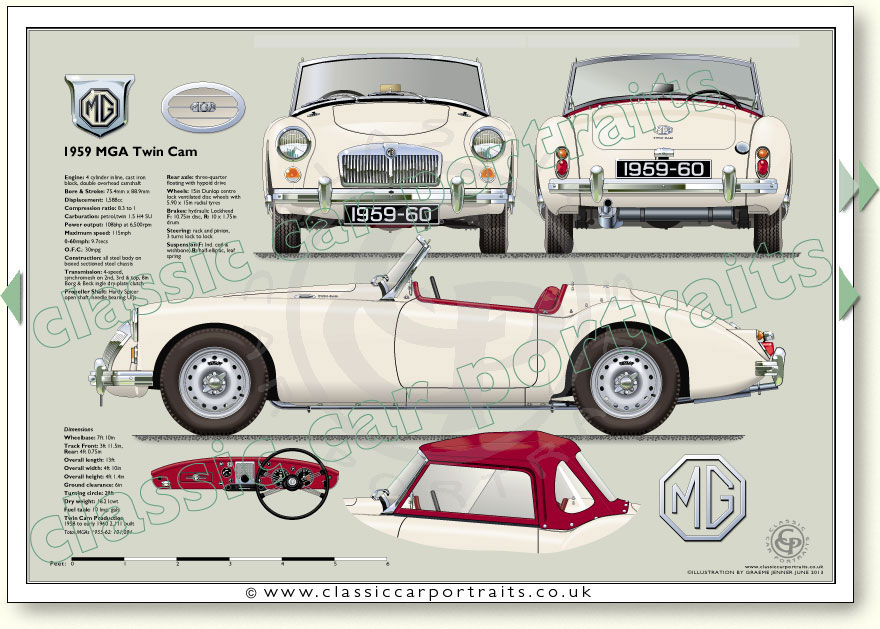 | MGA Twin Cam 1959-60 (later lights) See specifications and an old advert below illustration. To MGA page. Page 056D |