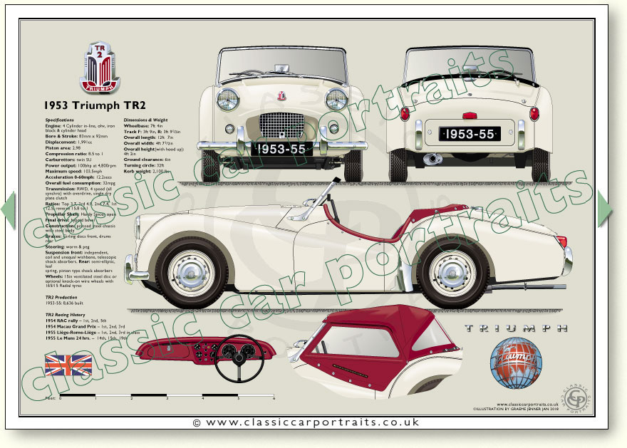 Bolt on steel disc or optional knock-on wire wheel with 15in x 155 Goodyear radial tyres Dimensions & Weight Wheelbase: 7ft 4in Track - front: 3ft 9in Track - rear: 3ft 91/2in Overall length: 12ft 7in Overall width: 4ft 71/2in Overall height(with hood up): 4ft 2in Ground clearance: 6in Turning circle: Left 34ft Unladen weight: 2,100 lbs Production TR2 1953-55: 8,636 TR3 1955-57: 13,378 TR3A 1958-62: 58,236 TR3B (1963 for USA only): 3,331 |